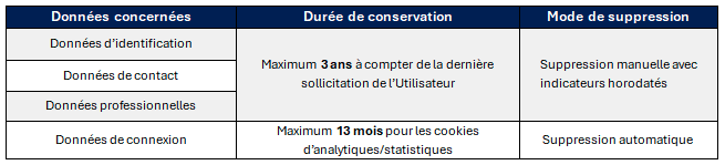 • La durée de conservation des données varie en fonction des finalités poursuivies :