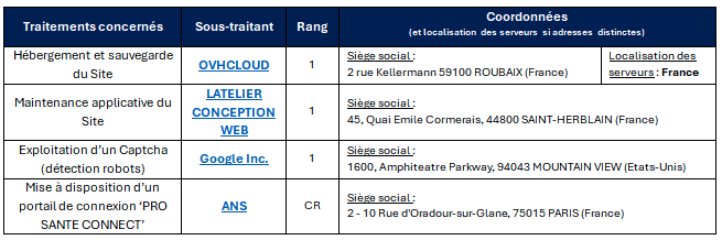 L’URML PAYS DE LA LOIRE informe les Utilisateurs que le bon fonctionnement du Site nécessite l’intervention de plusieurs sous-traitants de rang 1 et de rang 2 [ci-après dénommé(s) le ou les « Sous-traitant(s) »] dans le cadre des traitements suivants :